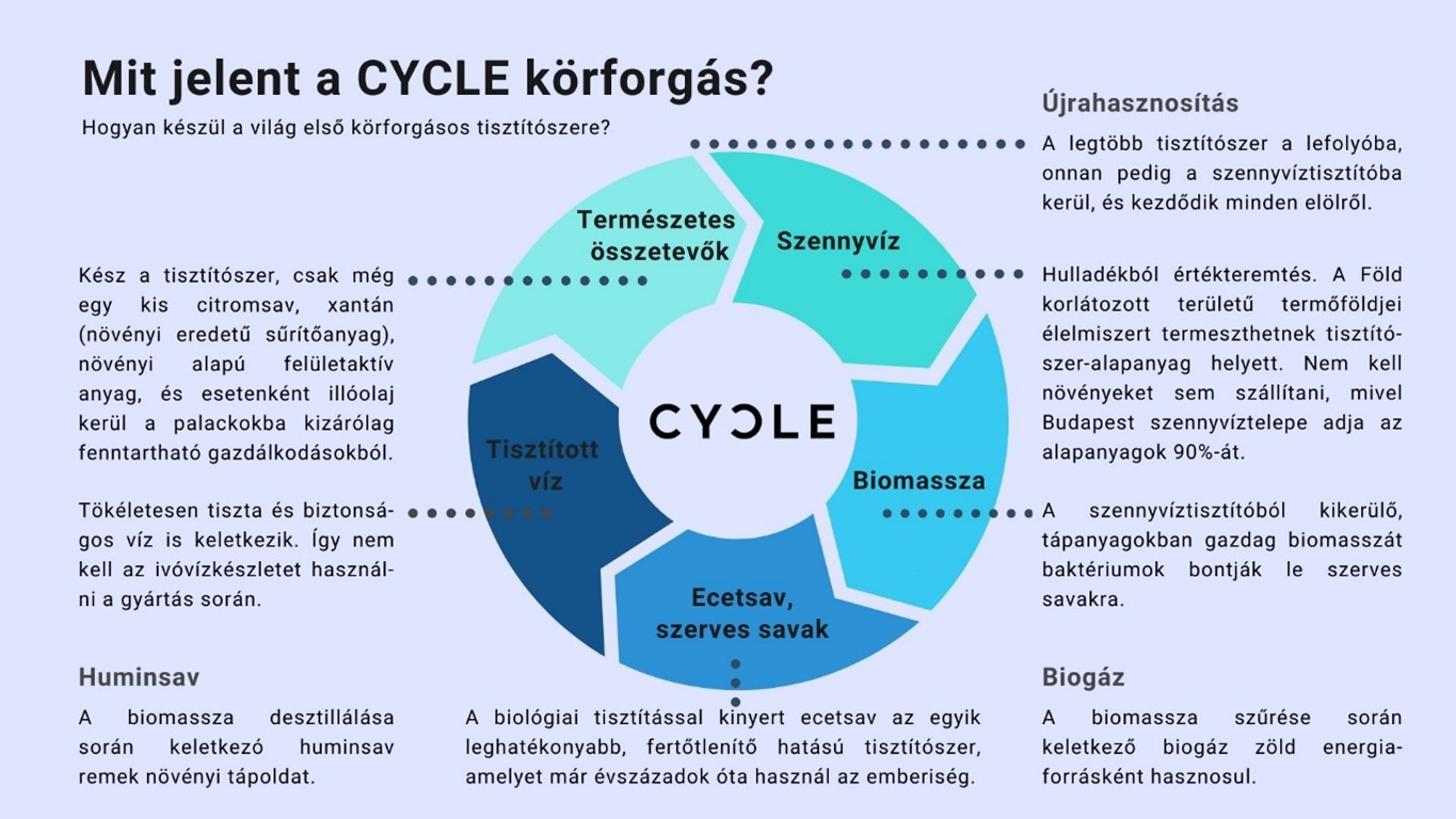 A CYCLE is a vizet hasznosítja, ahogy a természet is. Csak a CYCLE az emberek által használt vizet forgatja és hasznosítja újra és újra. Hogyan? A budapesti emberek által elhasznált vizet egy szennyvíztisztító gyűjti össze, ahol megtisztítják, hogy ne szennyezze a környezetet. A tisztítás során egy szervesanyag-keverék képződik: a biomassza. Ezt baktériumok bontják tovább szerves savakra és tisztított vízre. Ez adja a CYCLE tisztítószerek tartalmának 90%-át. Még néhány természetes összetevő adódik ehhez, és kész is az újrahasznosított tisztítószer. Majd takarítás után ezek a lefolyóba kerülnek, amikor kiöntöd az elhasznált vizet, a felmosóvizet, és leöblíted a WC tisztítót. Tehát a tisztítószer visszakerül elhasznált vízként a CYCLE csapatához, és kezdődik minden elölről.